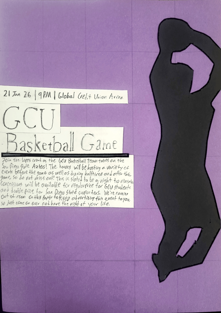 Today, I developed one of my grid layouts from my previous post into a full poster. Both the original layout and the final poster are below. The layout I chose left a lot of negative space open, which really emphasized the two main points of the poster: The silhouette of the basketball player and the “GCU Basketball Game” header. This grid layout helped me with decisions regarding hierarchy and placement by keeping me aware of where each item was supposed to be in relation to the grid. The grid was imperative to ensuring that the subheading and the body text were in an appropriate location that gave space to the header and even more space to the image.